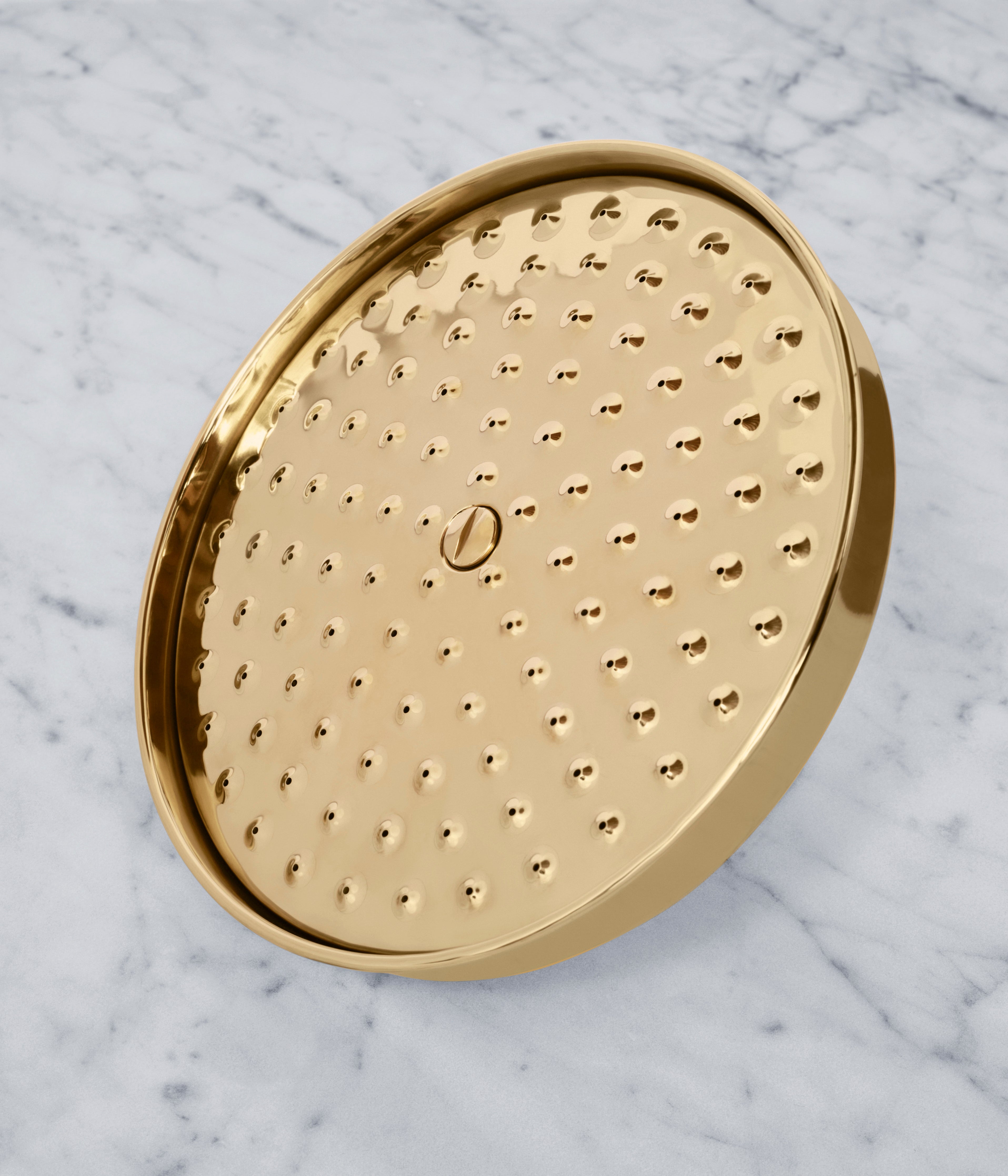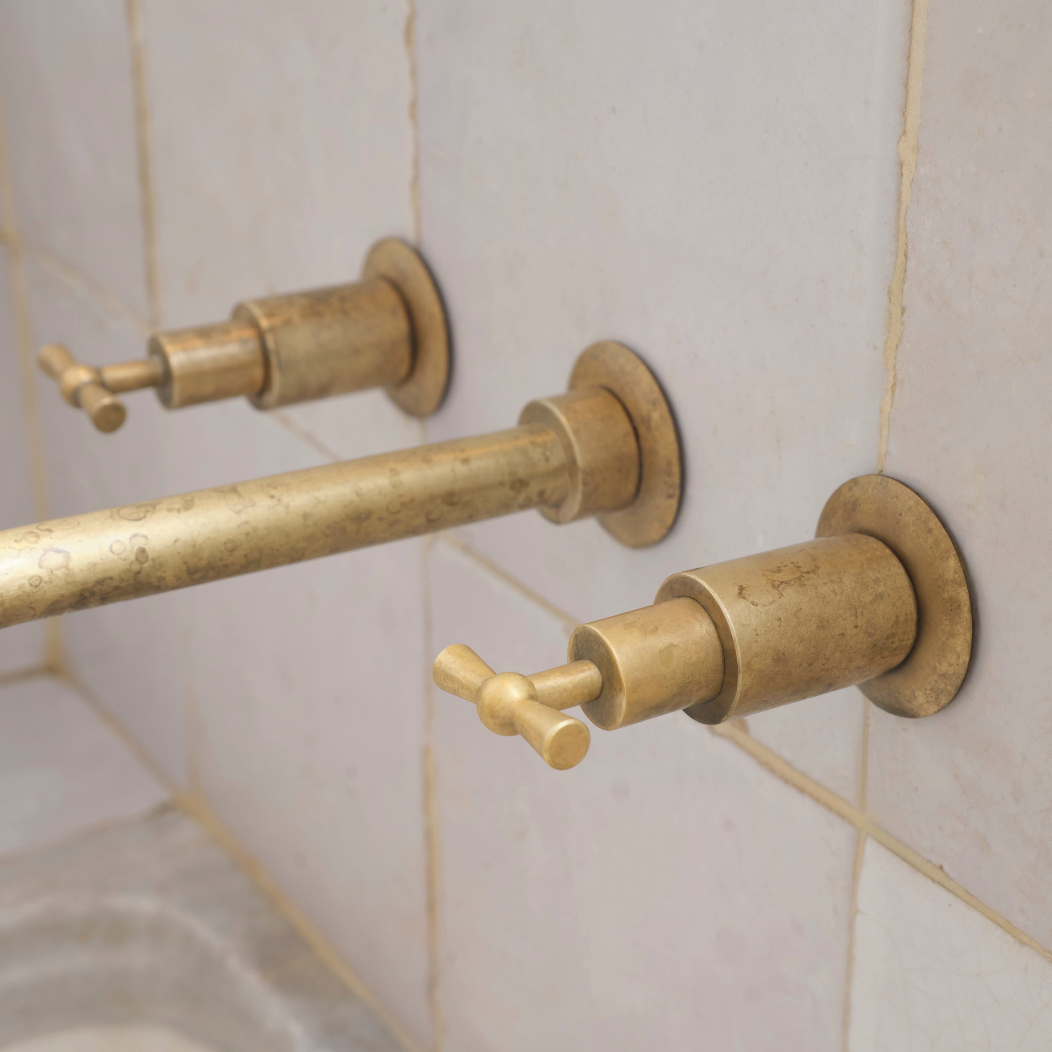 Shower heads fitted with rub-clean silicone nozzles can be ordered upon request without additional cost and are cleaned by gentle rubbing as water is rinsing through the fitting. Since the shower head is permanently exposed to water the ageing process of unvarnished brass is particularly swift and the head will darken and develop beautiful Verdigris. Regularly tilt the showerhead backwards to empty remaining water and clean using Sidol or Brasser to keep luster and shine.
